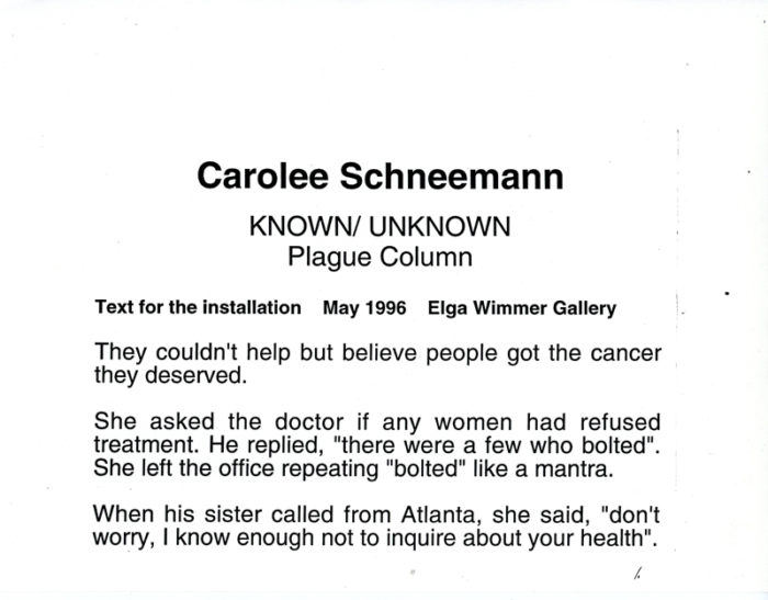 Elga Wimmer PCC, Carolee Schneemann, Known/Unknown Plague Column, Card and Text for Installation, 1996.