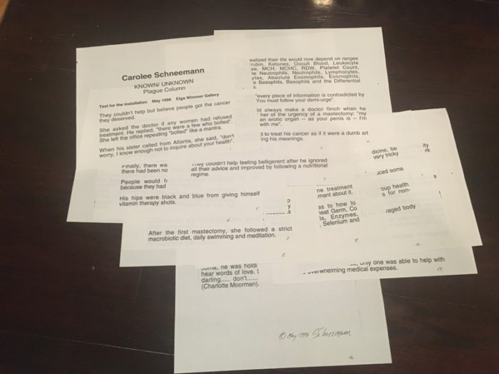 Carolee Schneemann, Known/Unknown Plague Column, Elga Wimmer Gallery, 16 Page Text by Schneemann and Exhibition Card, 1996