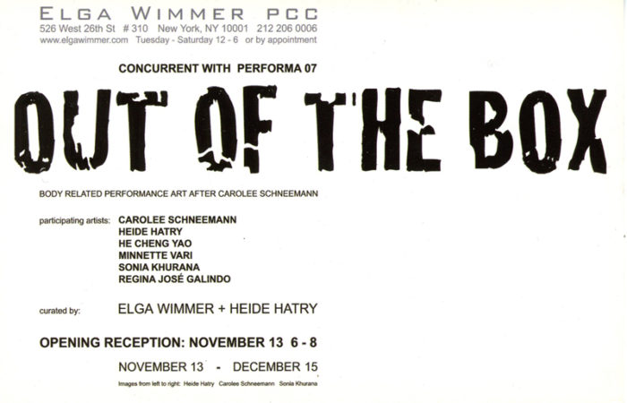 Carolee Schneemann, Group Show of “Body Related Performance Art after Carolee Schneeman, Elga Wimmer PCC, Card, 2007