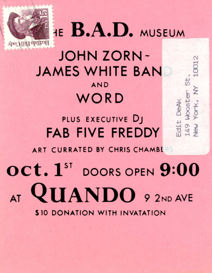 B.A.D. Museum, Invite for Guerrilla Party at Quando, John Zorn, James White, Fab Five Freddy, 1988