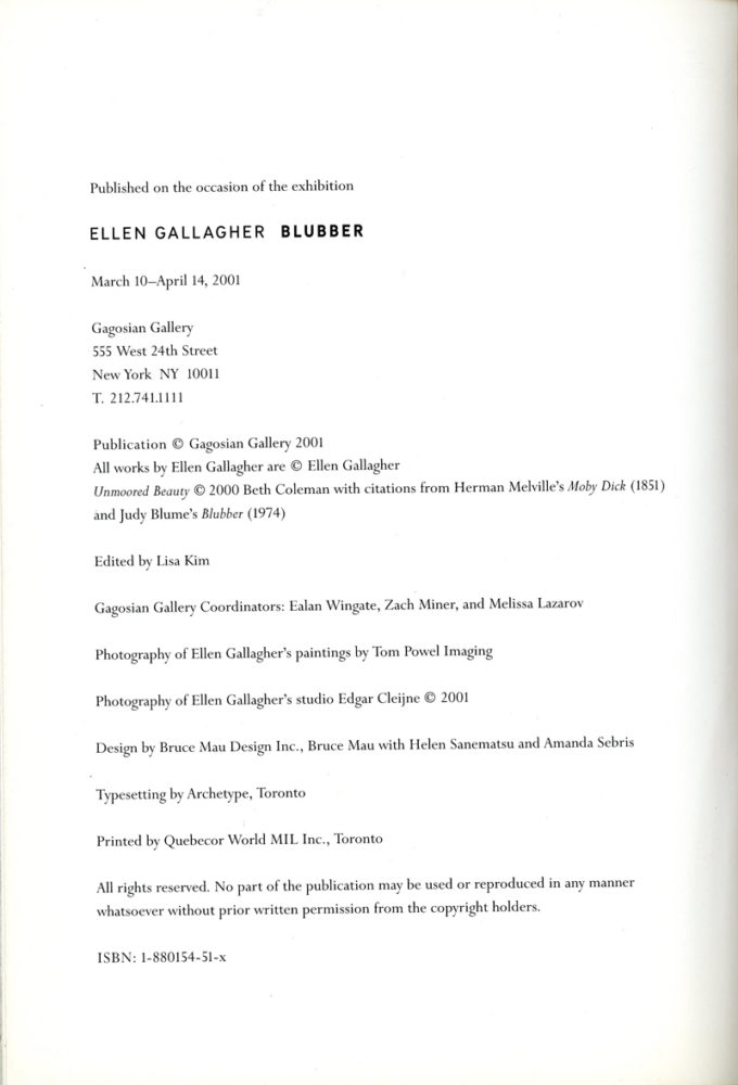 Gagosian Gallery, Ellen Gallagher, Blubber, Catalogue, March 10 – April 14 2001.