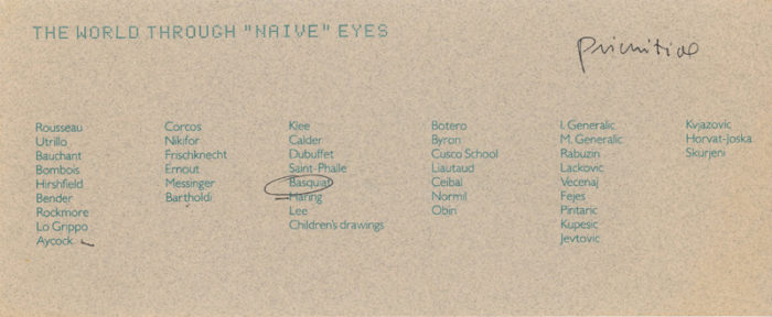 Gallery Urban, The World Through “Naive” Eyes, Jean-Michel Basquiat and Others, Card, 1987. Basquiat name circled in pen and the word “primitive” written in upper right. This card comes from the collection of art critic Edit DeAk.