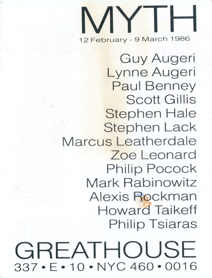 Announcement card for a group show entitled MYTH at Greathouse Gallery, February 12 – March 9, 1986.