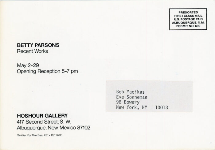 Announcement card for an exhibition of recent works by Betty Parsons at Hoshour Gallery in Albuquerque New Mexico, May 2 – 29, 1982.