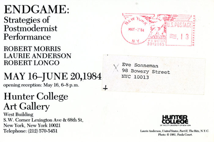 Laurie Anderson, Robert Morris, Robert Longo, Hunter College Art Gallery, Card, 1984