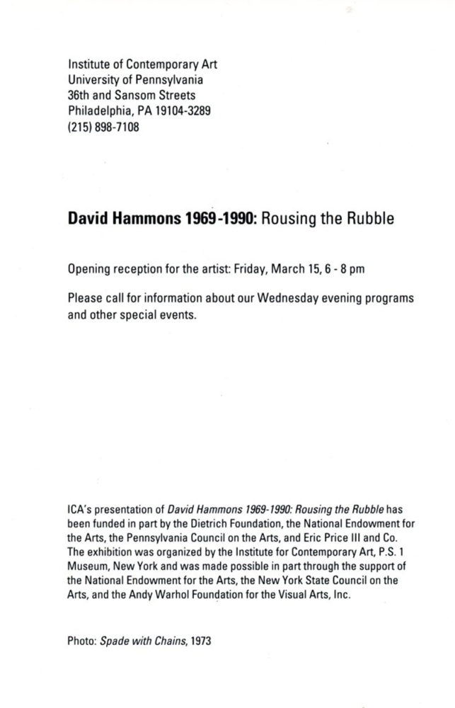 David Hammons, Rousing the Rubble, Card, Institute of Contemporary Art (Pennsylvania), 1990/91