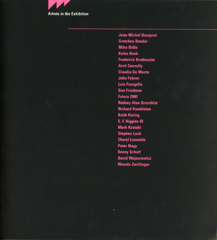 Exhibited artists include: Jean-Michel Basquiat, Gretchen Bender, Mike Bidlo, Keiko Bonk, Frederick Brathwaite, Arch Connelly, Claudia De Monte, John Fekner, Luis Frangella, Dan Friedman, Futura 2000, Rodney Alan Greenblat, Richard Hambleton, Keith Haring, E.F. Higgins III, Mark Kostabi, Stephen Lack, Cheryl Laemmle, Peter Nagy, Kenny Scharf, David Wojnarowicz, and Rhonda Zwillinger.