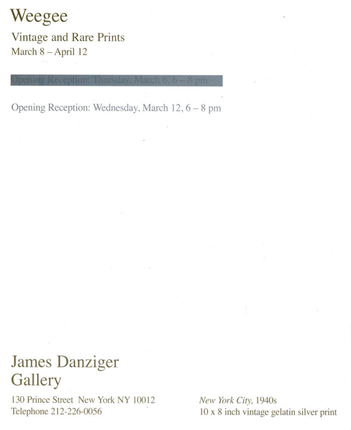James Danziger Gallery, Weegee, Card, 1997, with photo titled “New York City,” 1940s.