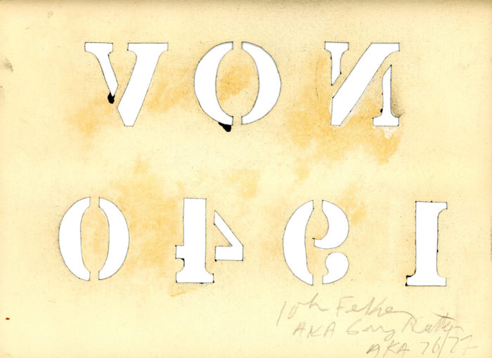 Hand-cut card with spray paint residue by John Fekner, 12″ x 9″. Signed in pencil on reverse.