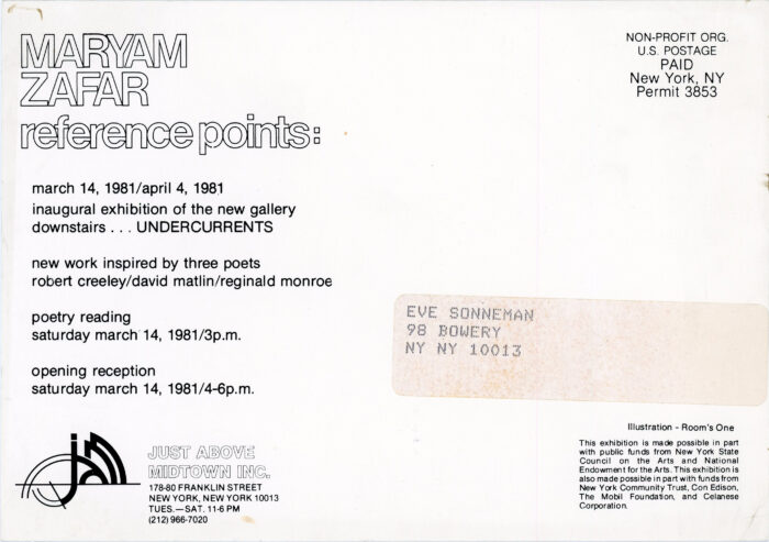 Maryam Zafar, Undercurrents, Just Above Midtown, Reference Points, Card, 1981
