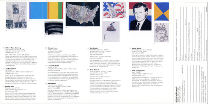 Kennedy for President Committee, Artists for Kennedy, Rauschenberg, Warhol, Serra, Oppenheim, Sonfist, among others, Brochure, 1980.