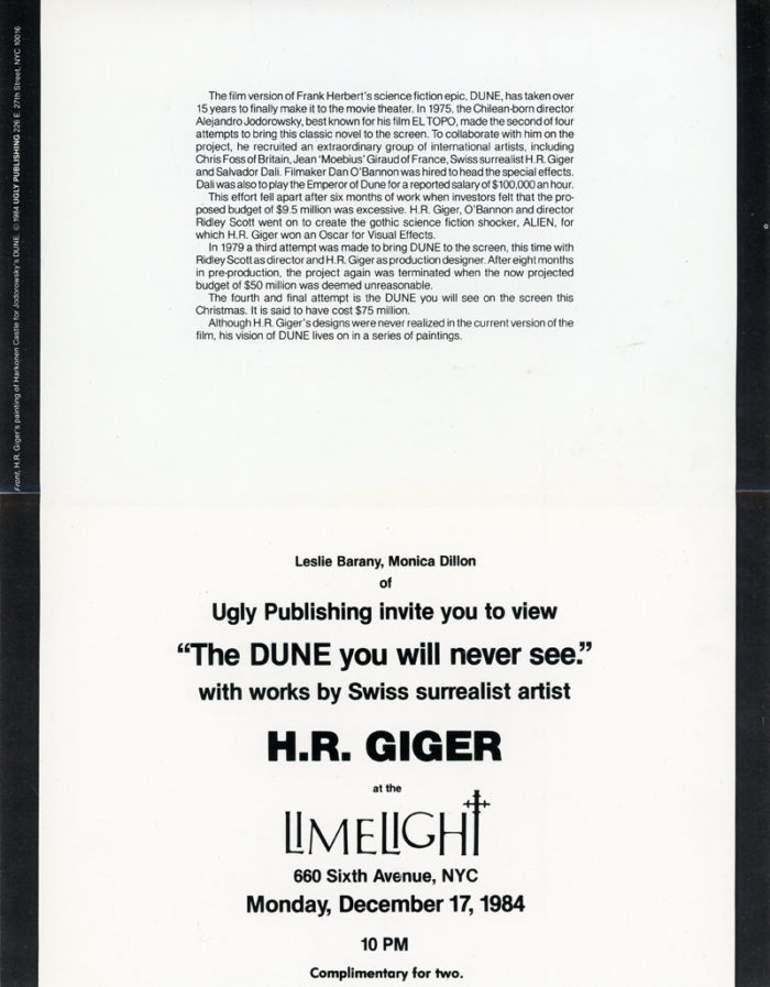 Limelight, H.R. Giger, Ridley Scott, DUNE, Folded Card, 1984