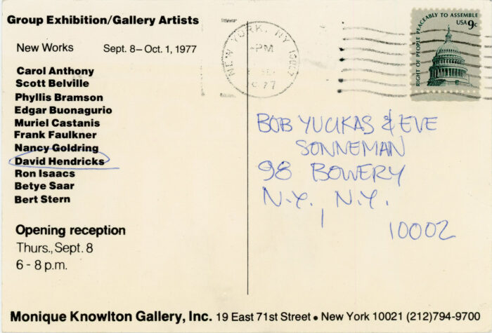 Betye Saar, Group Exhibition, Monique Knowlton Gallery, Card, 1977
