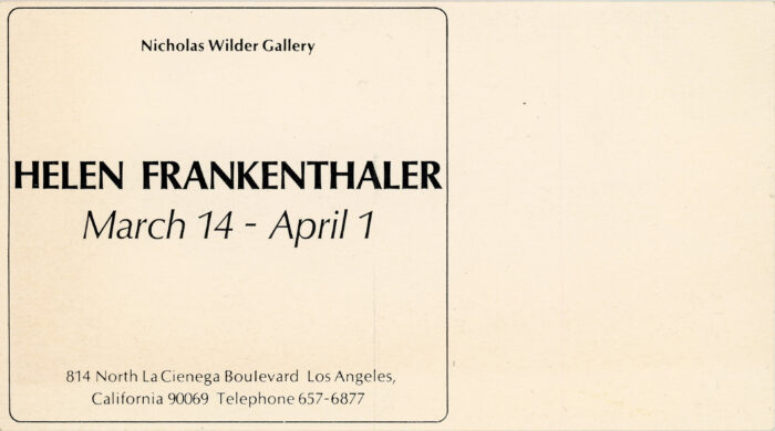 Announcement card for an exhibition by Helen Frankenthaler at Nicholas Wilder Gallery in Los Angeles, March 14 – April 1, c. 1980s.