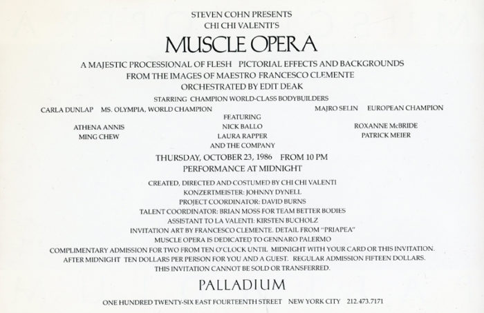 Palladium, Chi Chi Valenti’s Muscle Opera, Pictorial effects and backgrounds by Francesco Clemente and orchestrated by Edit deAk, Card, October 23 1986, Size: 8 ½ x 5 ½