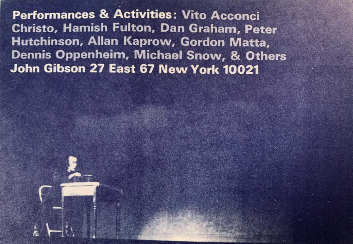 Performance & Activities, Group Show with Vito Acconci, Christo, Gordon Matta, Dennis Oppenheim, & Others, card, John Gibson Gallery, 1970