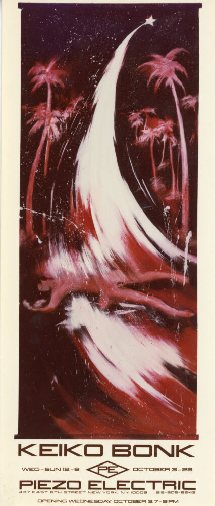 Announcement card for an exhibition by Keiko Bonk at Piezo Electric, October 3-28, 1984.