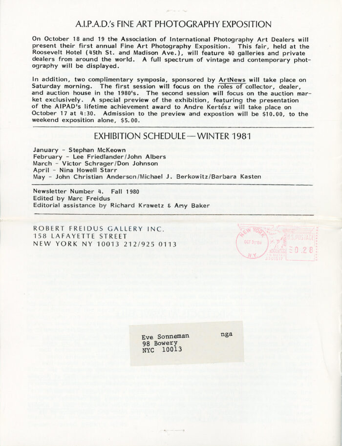 8-page staplebound newsletter booklet by Robert Freidus Gallery intended to announce upcoming exhibitions and projects by the gallery and its artists. These newsletters also advertised editions and portfolios by the gallery’s artists.