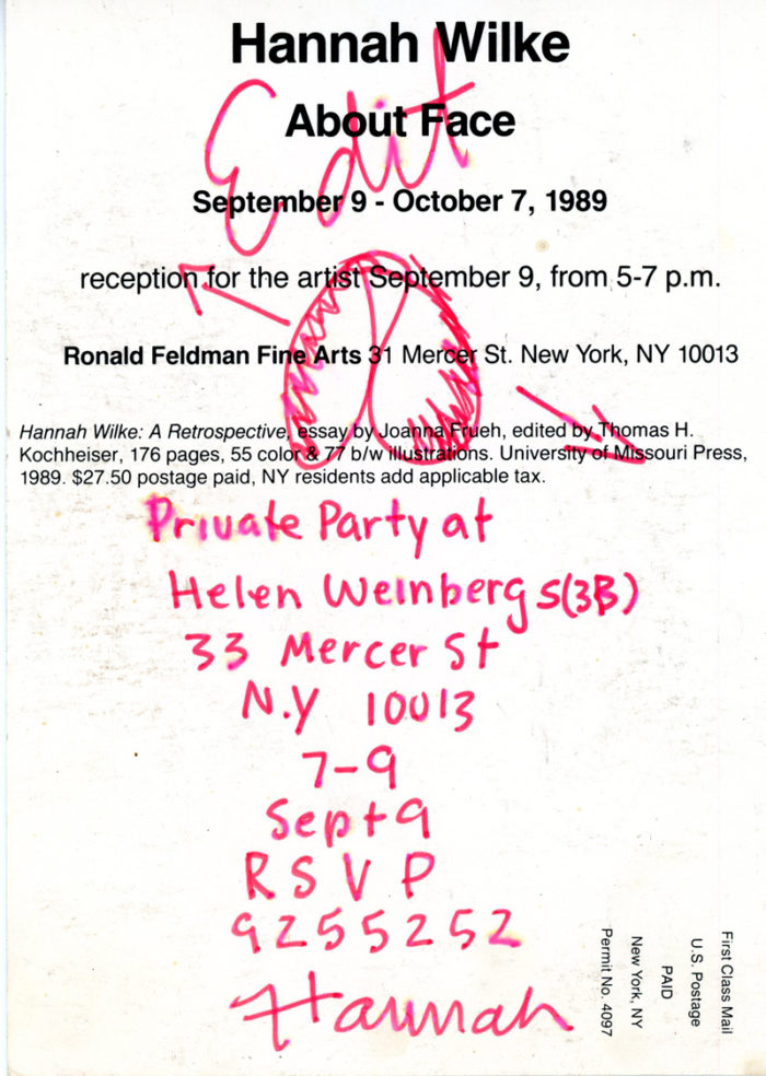 Ronald Feldman Fine Arts, Hannah Wilke, About Face, Card with drawing by Wilke, 1989