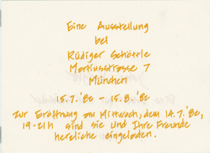 Small staplebound booklet with titles of works displayed by Gallery Rüdiger Schöttle at the art fair Eine Ausstellung in Munich Germany, July 15 – August 15, 1982.