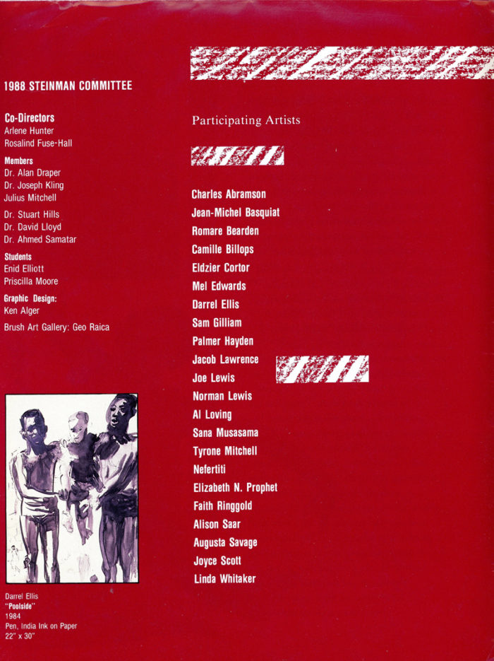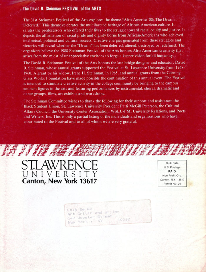 Foldout brochure/poster for the David B. Steinman Festival of the Arts at St. Lawrence University (Canton, NY), March 3-14, 1988. Included artists: Faith Ringgold, Alison Saar, Jean-Michel Basquiat, Jacob Lawrence, Al Loving, and more.