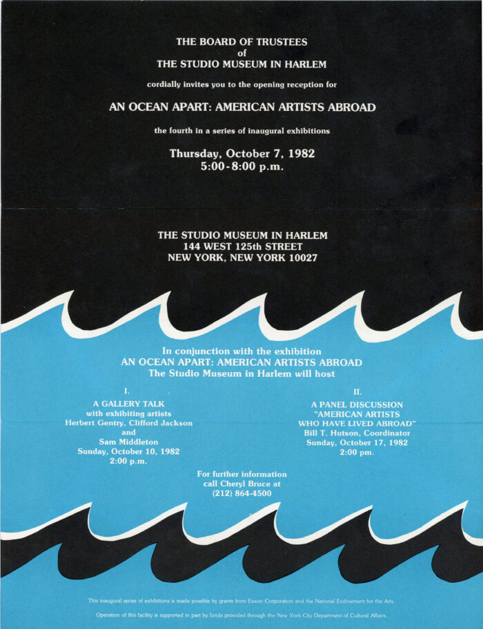 Tri-folded announcement card for the opening of an exhibition at the Studio Museum in Harlem entitled “An Ocean Apart: American Artists Abroad,” October 7, 1987.
