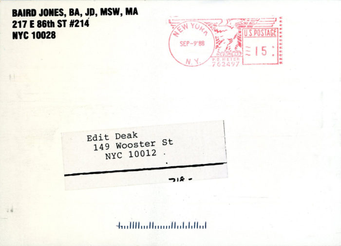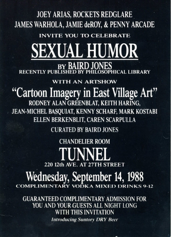 Tunnel, Sexual Humor by Baird Jones, “Cartoon Imagery” with Basquiat, Haring, Kostabi, Scharf, etc, Card, September, 1988.