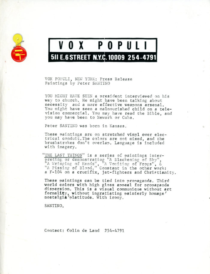 Vox Populi, Peter Santino, The Last Things, Folded Card and Press Release, 1984