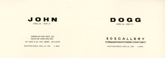 Folded card for John Dogg’s exhibition at 303 Gallery and American Fine Arts, 1987.