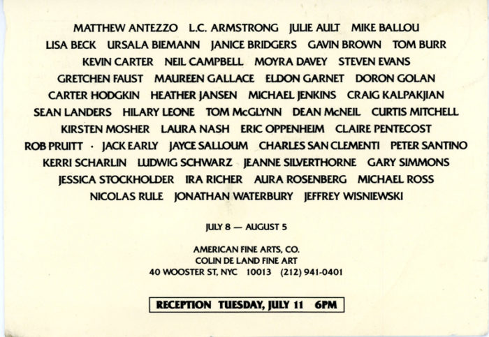 American Fine Arts Co., Jessica Stockholder, Gretchen Faust, Gary Simmons, Rob Pruitt and others, Card, 1989