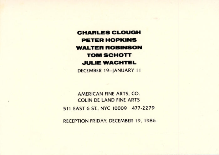 American Fine Arts Co., Walter Robinson, Julie Wachtel, Charles Clough, Peter Hopkins, Tom Schott, Card, 1986