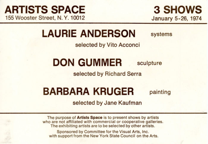 Artists Space, Laurie Anderson selected by Vito Acconci, Don Gummer selected by Richard Serra, Barbara Kruger selected by Jane Kaufman, Card, 1974