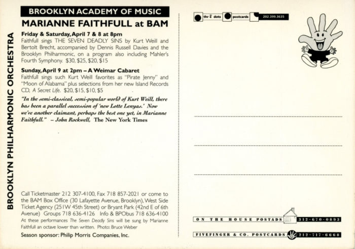 Brooklyn Academy of Music, Marianne Faithfull, Card, 1995