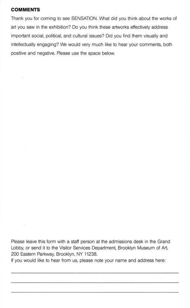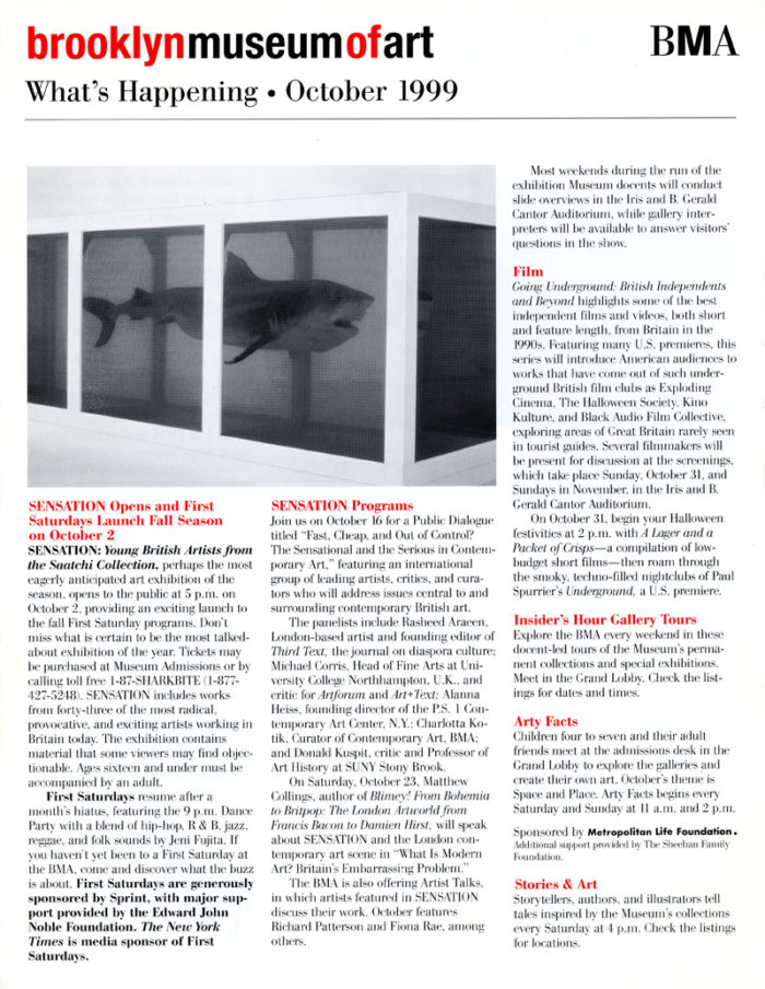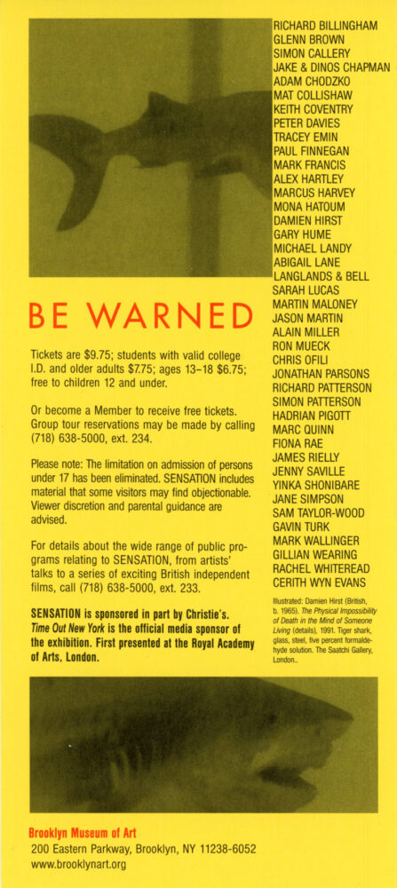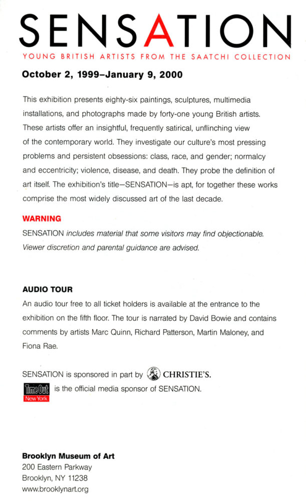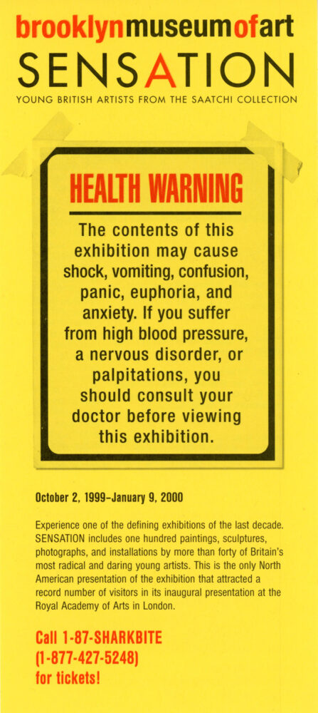 Brooklyn Museum of Art, Sensation Exhibition, Health Warning (For Sensation Exhibition) Signage, Brochure, Information Sheet, Ticket & Newspaper Clippings by Roberta Smith and Philippe De Montebello, 1999