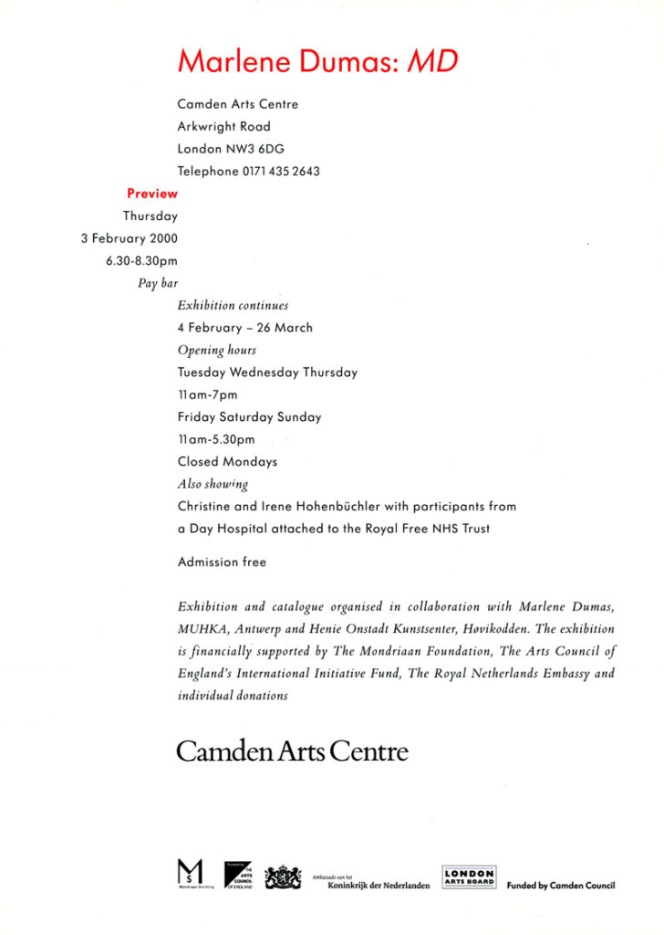 Marlene Dumas, MD, Card, Camden Arts Center (London), 2000