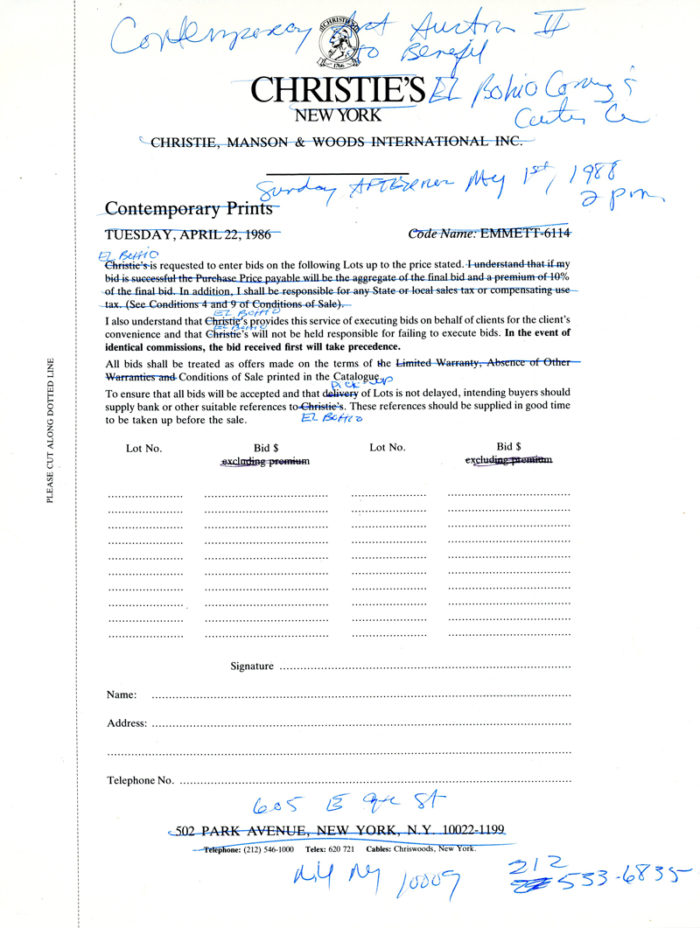 Contemporary Art Auction to Benefit El Bohio, Basquiat, Scharf, Wong, Working Catalogue with Notes, 1985
