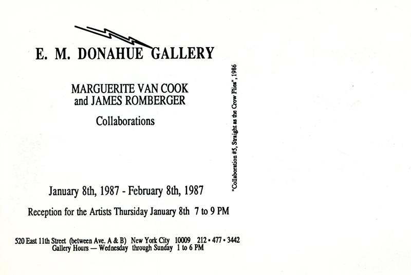 Marguerite Van Cook and James Romberger, Card, E.M. Donahue Gallery, 1987
