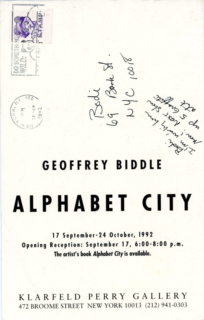 Geoffrey Biddle, Alphabet City, Card, Klarfeld Perry Gallery, 1992