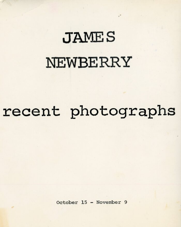 Folded card for Duane Michals’ exhibition at Light Gallery, 1974, with a photograph and excerpt from Michals in the inside of card. The outside of card advertises James Newberry’s Recent Photographs exhibition.