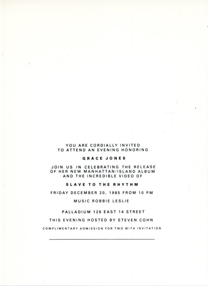 Palladium, Grace Jones, Folded Card, December 20, 1985