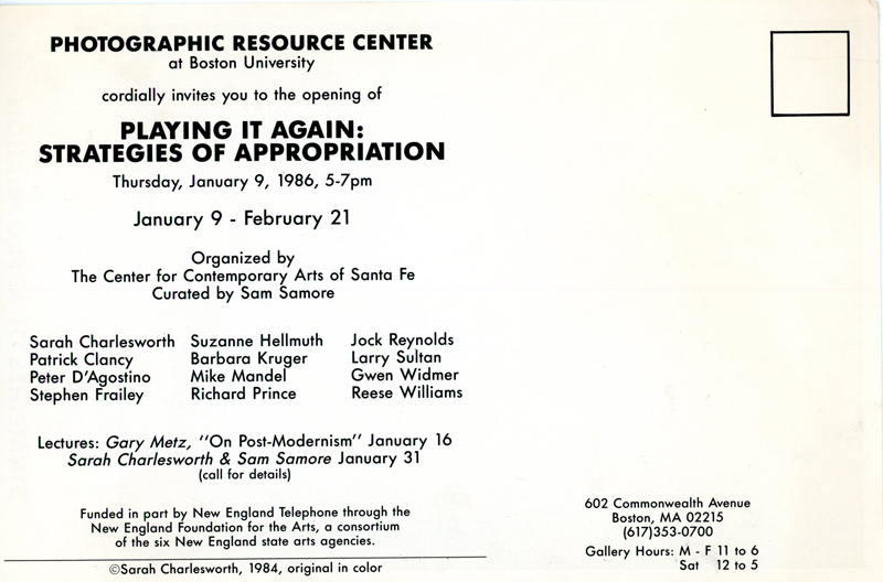 Group Show, Playing It Again: Strategies of Appropriation, With Sarah Charlesworth, Barbara Kruger, Richard Prince, Card, Photographic Resource Center (Boston University), 1986