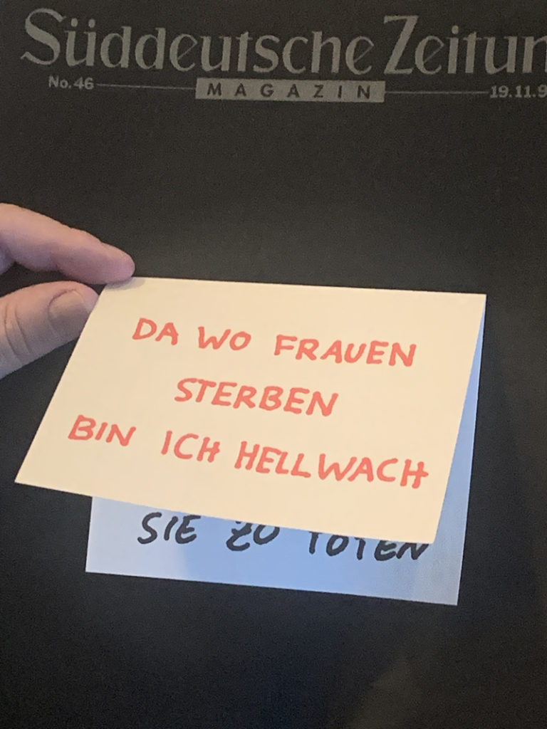 Outside of the folded front card reads “Where women die I am wide awake.”