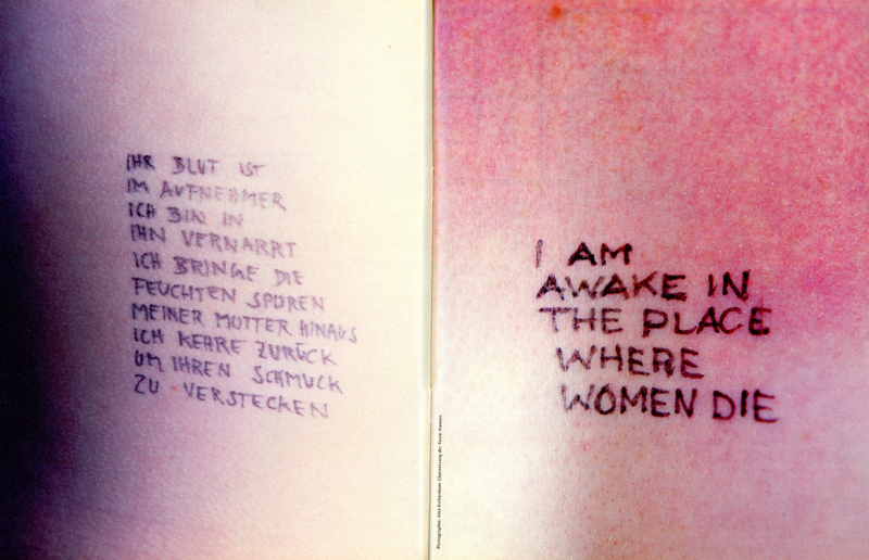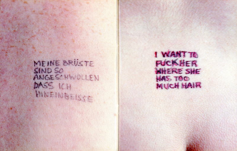Titling her work Lustmord (Sex Murder), Holzer addresses the systemic rape of women, with fragmented text reflecting the perspectives of the perpetrator, the rape victim and witnesses. She begins with the disturbing thoughts of the rapist murderer handwritten in German on a lift-up card attached to the magazine cover. Inside Holzer features close up photographs of phrases in English and German written in ink on naked flesh.