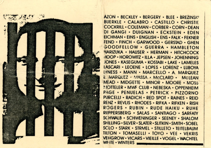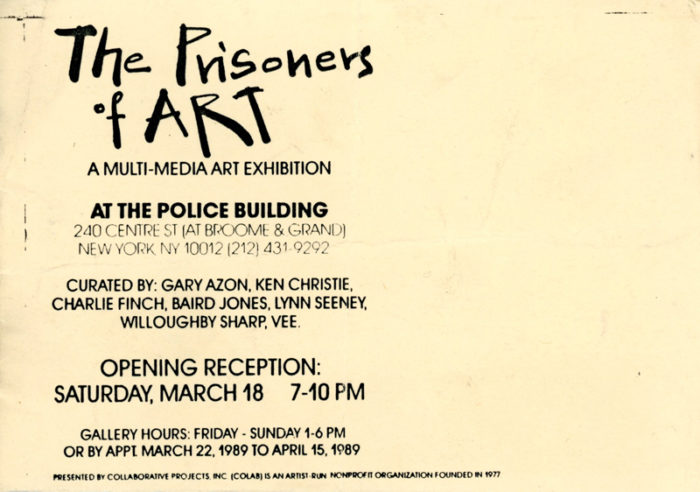 The Police Building, Prisoners of Art, Hambleton, Fekner, Kostabi, among others, Card, 1989. Curated by Baird Jones, Charlie Finch, Willoughby Sharp…