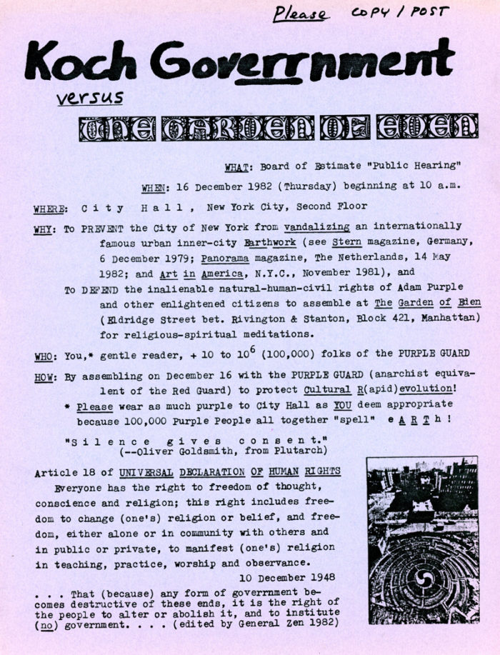 Adam Purple, Koch Government Versus The Garden of Eden, Flyer, City Hall, 1982