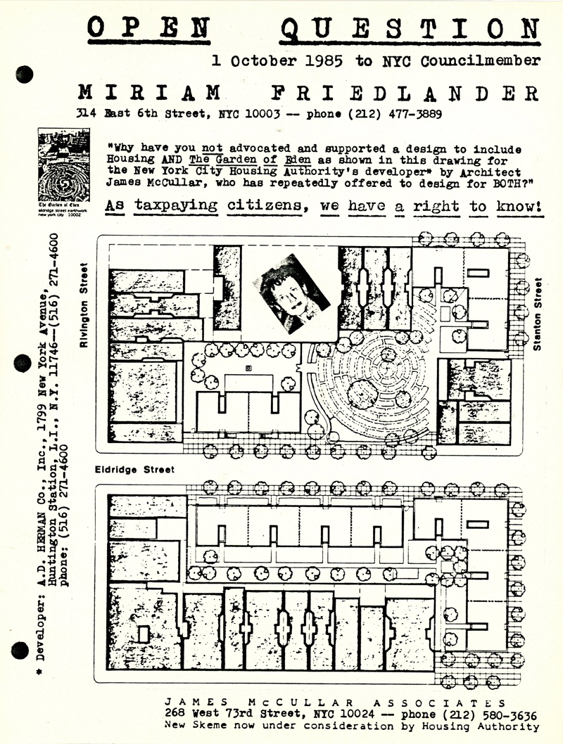 Adam Purple, Open Question to NYC Councilmember Miriam Friedlander, Flyer, 1985