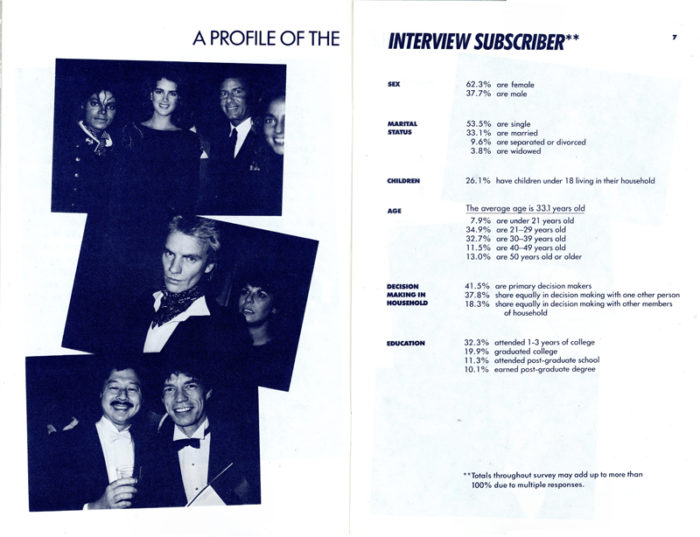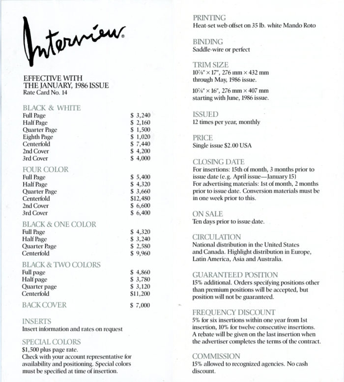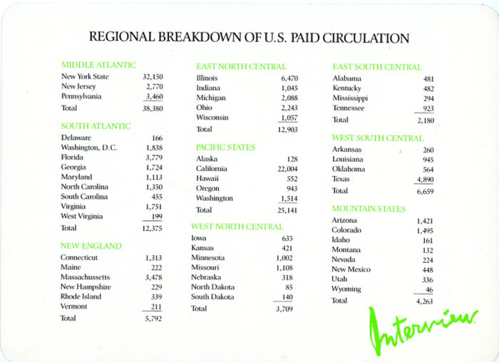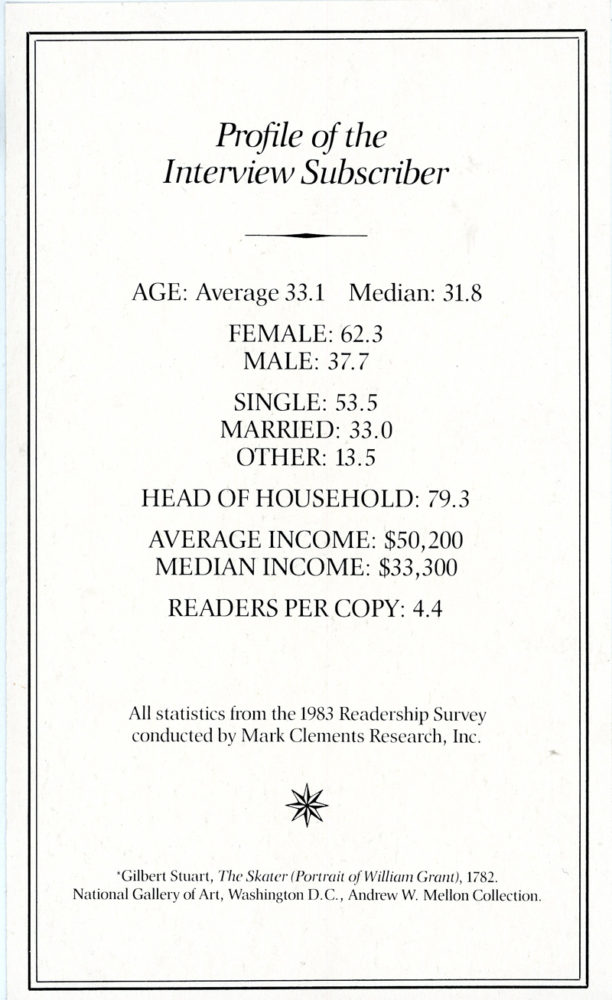 Advertising Rates (1986)Profile of Interview Subscriber (Card, 1984)Regional Breakdown of U.S. Paid Circulation (Card)Regional Breakdown of U.S. Paid Circulation (Card)Promotional Brochure FoldedPromotional Brochure UnfoldedAndy Warhol