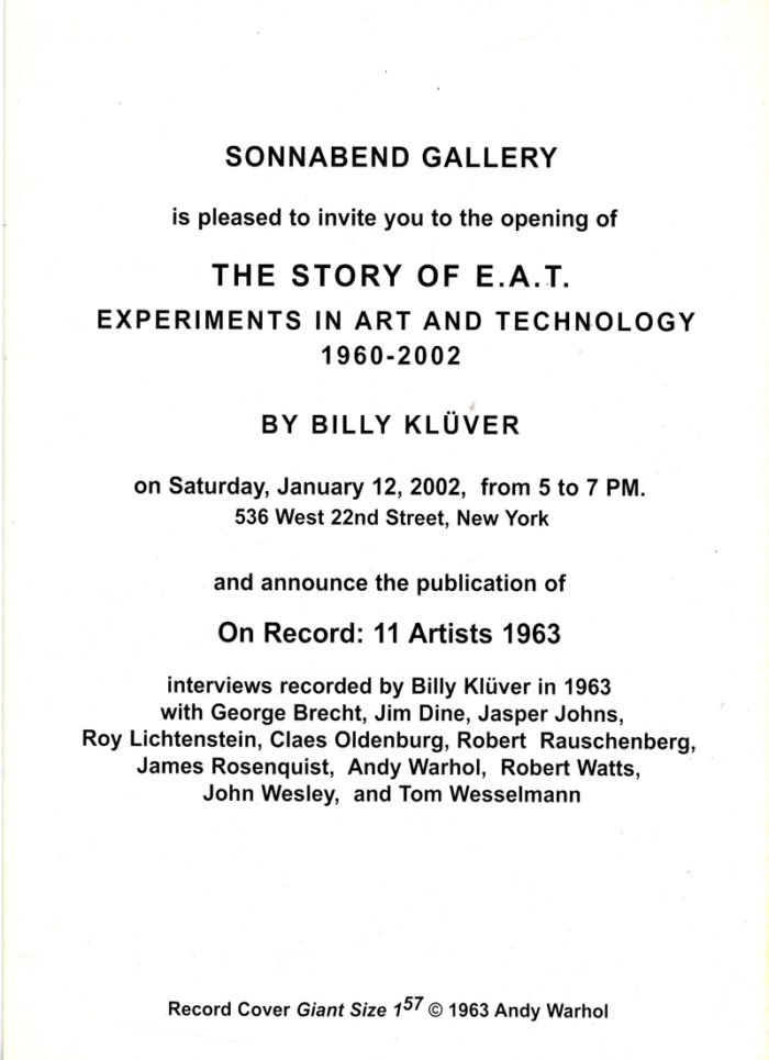 Billy Kluver, The Story of E.A.T. (Experiments in Art and Technology), Record Cover Giant Size by Andy Warhol, Card, Sonnabend Gallery, 2002