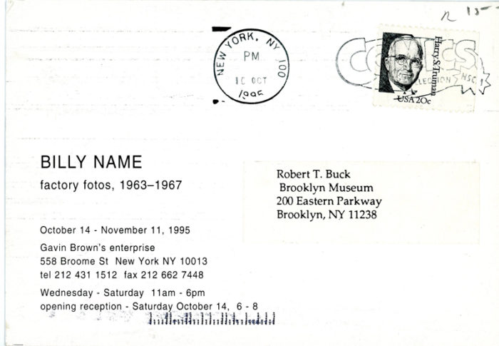 Billy Name, Factory Fotos 1963-1967, Card, Gavin Brown’s Enterprise, 1995
