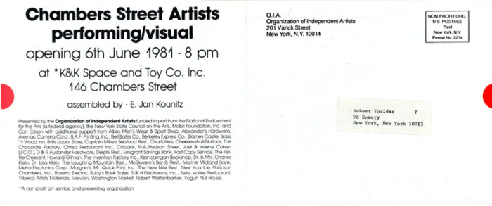 Chambers Street Artists, Group Show with Dean Savard (Co-founder of Civilian Warfare Gallery), Flyer, K&K Space and Toy Co. Inc, 1981
